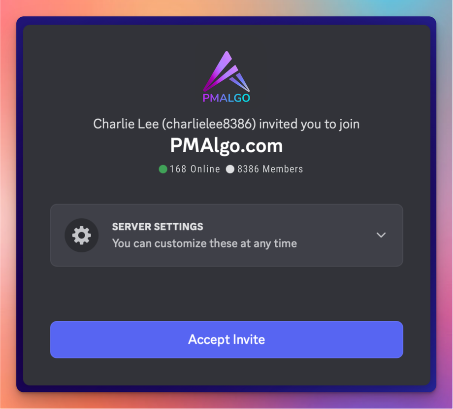 When you join the PMAlgo Discord server for the first time, you will see the server rules. You will only have access to our public channels until you accept them. If you haven't done so already, please join the server. click here.